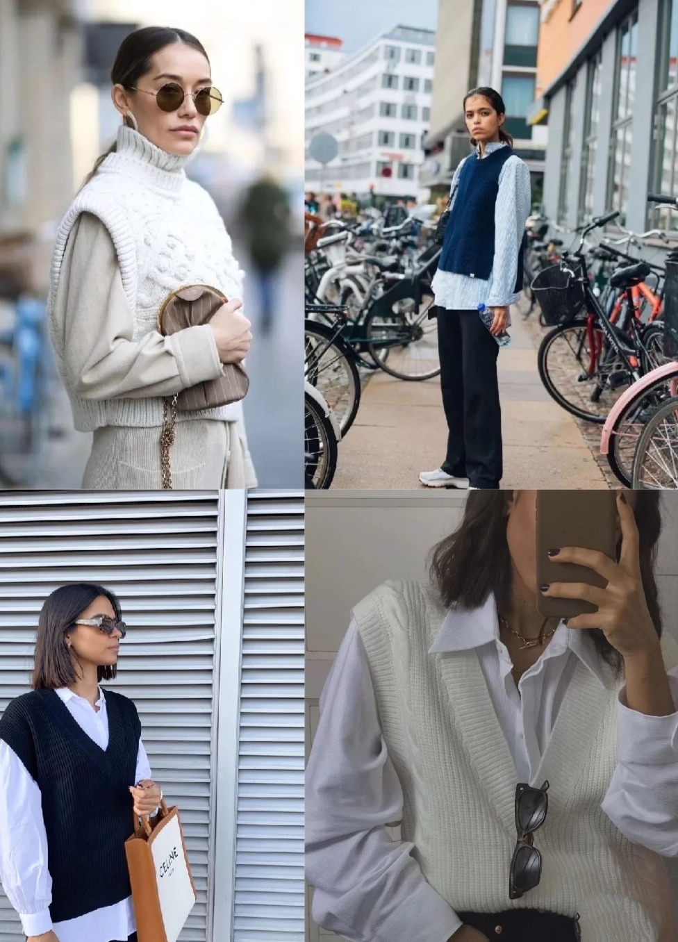 长款针织坎肩一般抵达膝盖、小腿或者脚踝部位,叠穿衬衫优雅温柔,不过要注意衬衫款式和里外配色问题,衬衫可以选择叠加彼得潘领、泡泡袖或者灯笼袖的款式,而里外配色需要保持协调。
