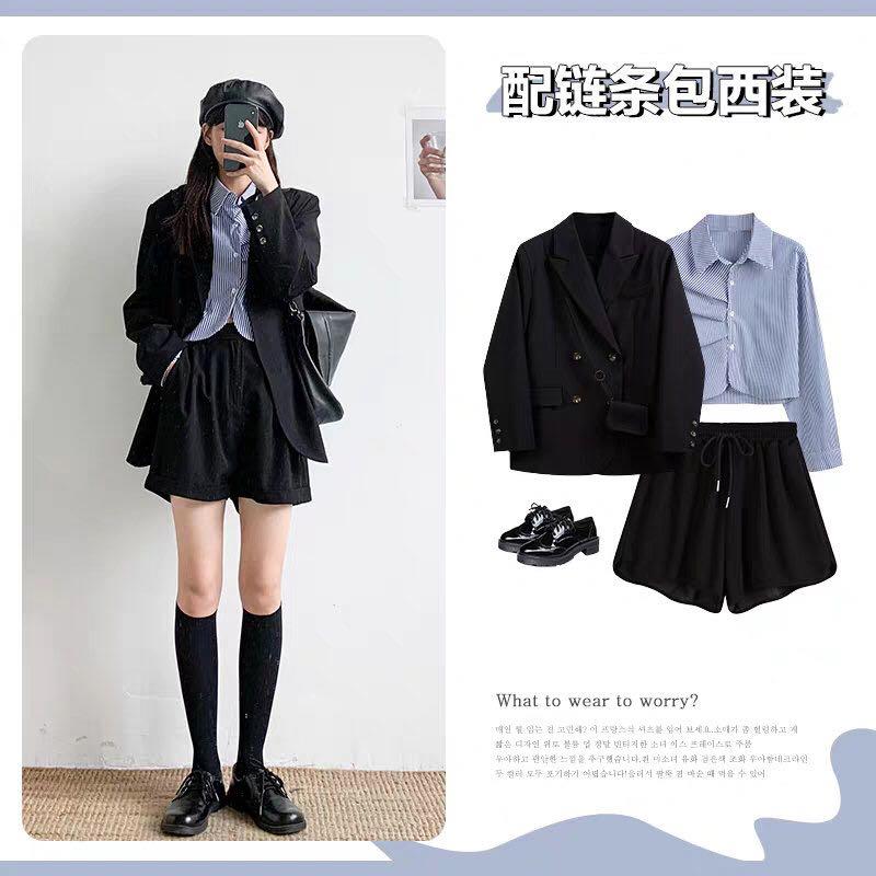秋天想要来点不一样的职场穿搭吗?可以挑选一件蓝白相间的衬衫,叠穿一件黑色的西装外套,这样的穿搭也太飒了吧,甜酷风十足!可以搭配一条黑色的西装短裤,展示出大长腿。